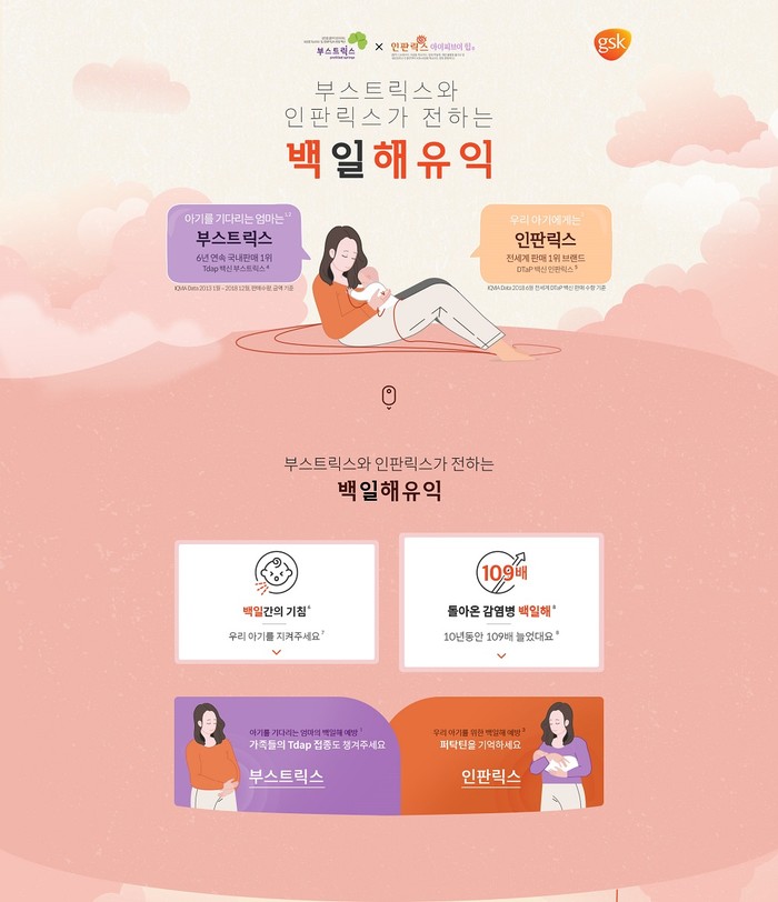 부스트릭스와 인판릭스IPV/Hib의 공동 홈페이지는 ‘백일해 유익’을 테마로 최근 국내에서 유행하고 있는 ‘백일해’에 대한 질환 정보 및 성인과 영·유아에서 백일해 예방을 위한 백신 정보를 제공한다.