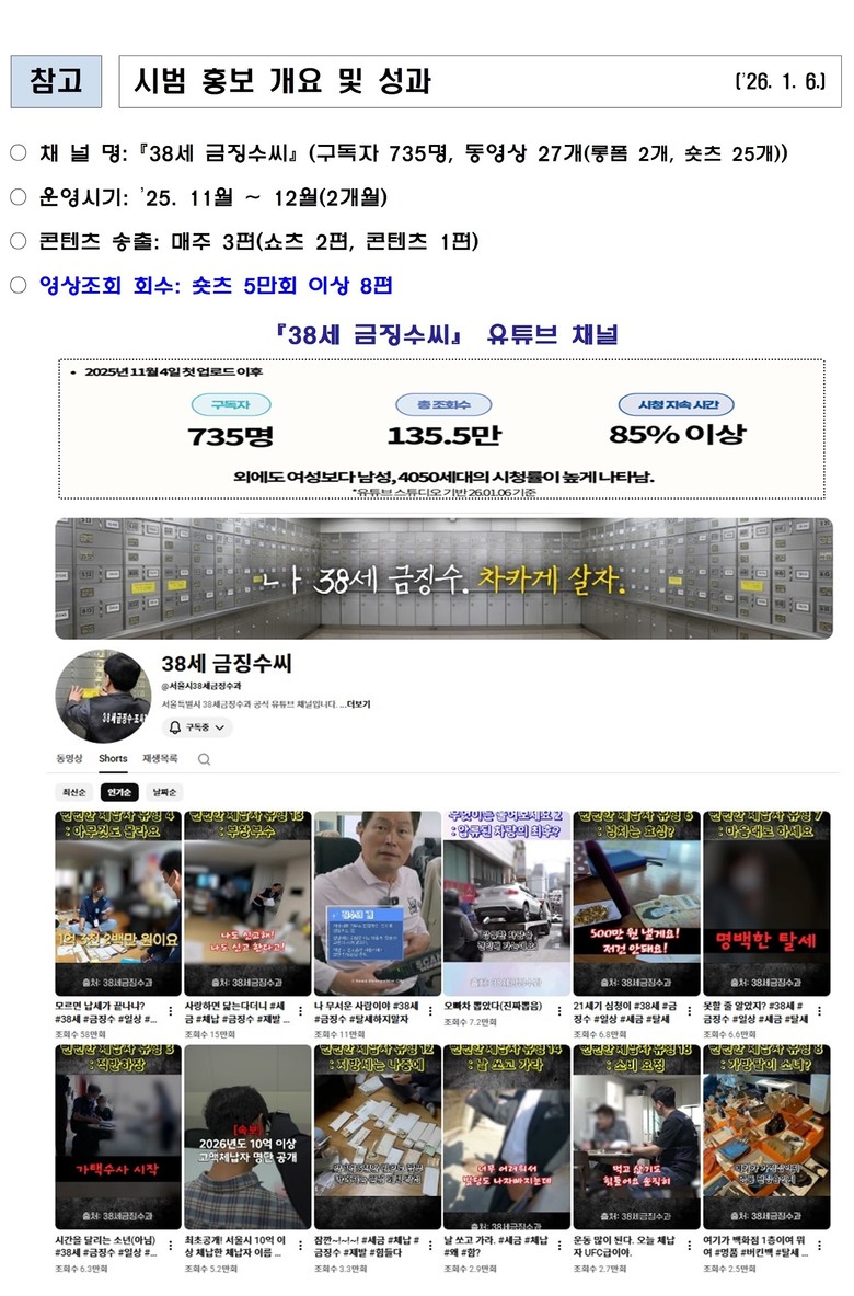 - “납세는 시민의 약속” 공정한 조세문화 확산과 함께 따뜻한 세무행정도 실천 [서울 세계타임즈=이장성 기자] 서울시 체납 지방세 징수 전담 부서인 38세금징수과가 자체 유튜브 채널을 2개월간(’25.11.4.~12.31) 운영한 결과, 총 조회수 135.5만 회를 기록하며 시민들의 높은 관심을 받고 있다.