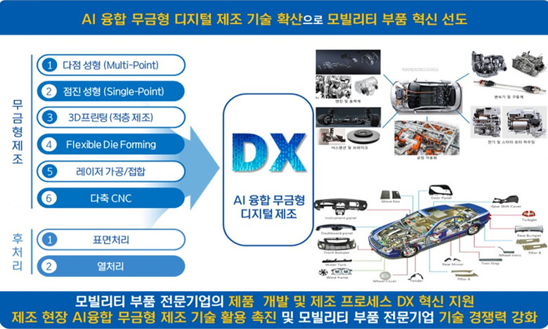 특히, 금형 없이도 복잡하고 정밀한 부품을 신속하게 생산하는 무금형 디지털 제조 기술에 인공지능(AI) 설계 및 공정 최적화 기술을 결합해 고부가가치 미래형 모빌리티 부품을 생산하는 새로운 제조 생태계 구축이 핵심이다.