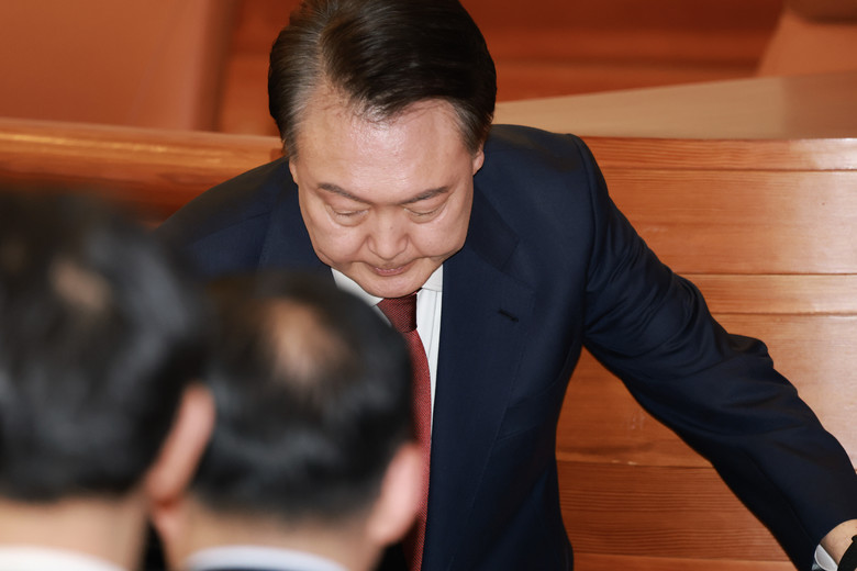 [세계타임즈 = 조윤수 기자] 윤석열 대통령 탄핵심판 5차 변론이 열린 4일 서울 종로구 헌법재판소 대심판정에 윤 대통령이 입장하고 있다. 2025.2.4 [사진공동취재단]