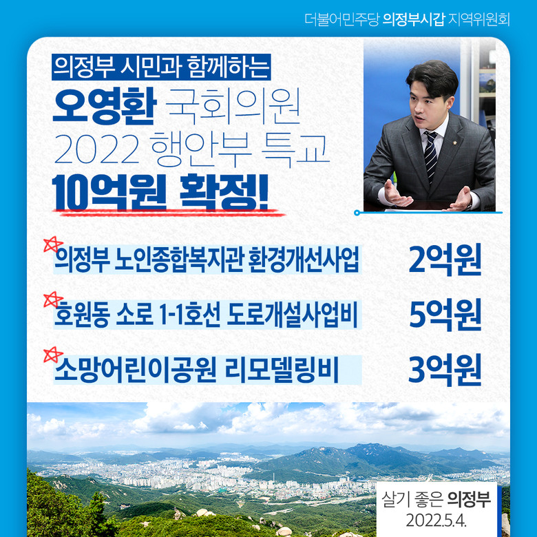 [세계타임즈 = 심귀영 기자] 오영환 국회의원(더불어민주당, 의정부시 갑)은 행정안전부 특별교부금 10억원이 확정되었다고 지난 4일 밝혔다.