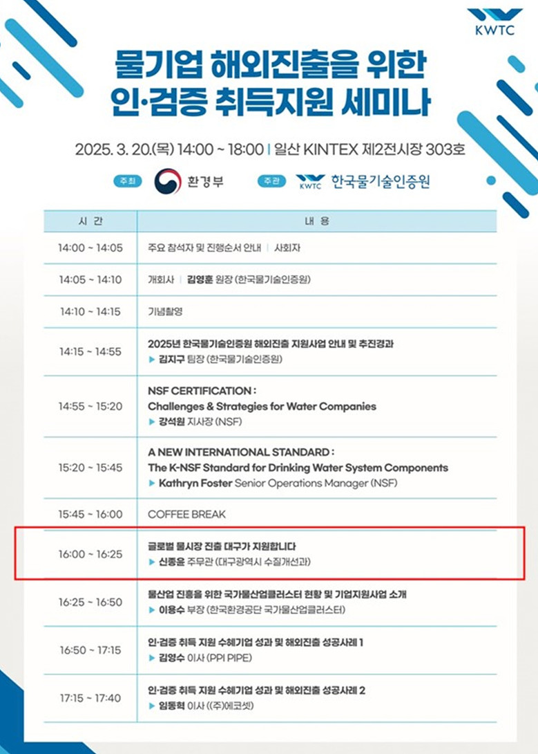 특히, 3월 20일(목) 행사 2일차에 열린 한국물기술인증원 주최 세미나에서는 기업 대표, 국내 물관련 학계 및 공공기관, 해외 관계자 등 100여 명이 참여한 자리에서 대구시 담당 주무관이 물기업의 해외진출을 위한 대구시 물산업 육성 정책과 지원 사업에 대해 발표하며 우수 물기업의 대구 유치를 위한 적극적인 활동을 펼쳤다.