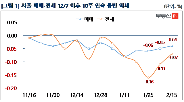부동산114(www.r114.com)에 따르면 금주 서울 아파트값은 0.04% 떨어져 13주 연속 하락했다. 서울 재건축 시장도 0.09% 하락해 15주 연속 내림세다. 신도시와 경기ㆍ인천은 각각 0.02% 떨어져 5주 연속 약세를 나타냈다. 전세가격도 서울과 신도시, 경기ㆍ인천지역 모두에서 하락했다. 서울이 0.07% 떨어졌고 신도시와 경기ㆍ인천도 각각 -0.07%, -0.09% 변동률을 나타냈다.