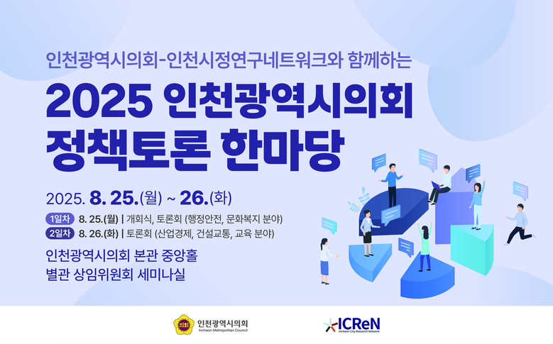 이번 ‘정책토론 한마당’은 정책의 실현 가능성과 실효성을 높이기 위해 인천시의 정책 수립과 시행에 직접적으로 기여하고 있는 15개 공공기관으로 구성된 공동 정책연구 협의체인 인천시정연구네트워크와 공동으로 개최된다.