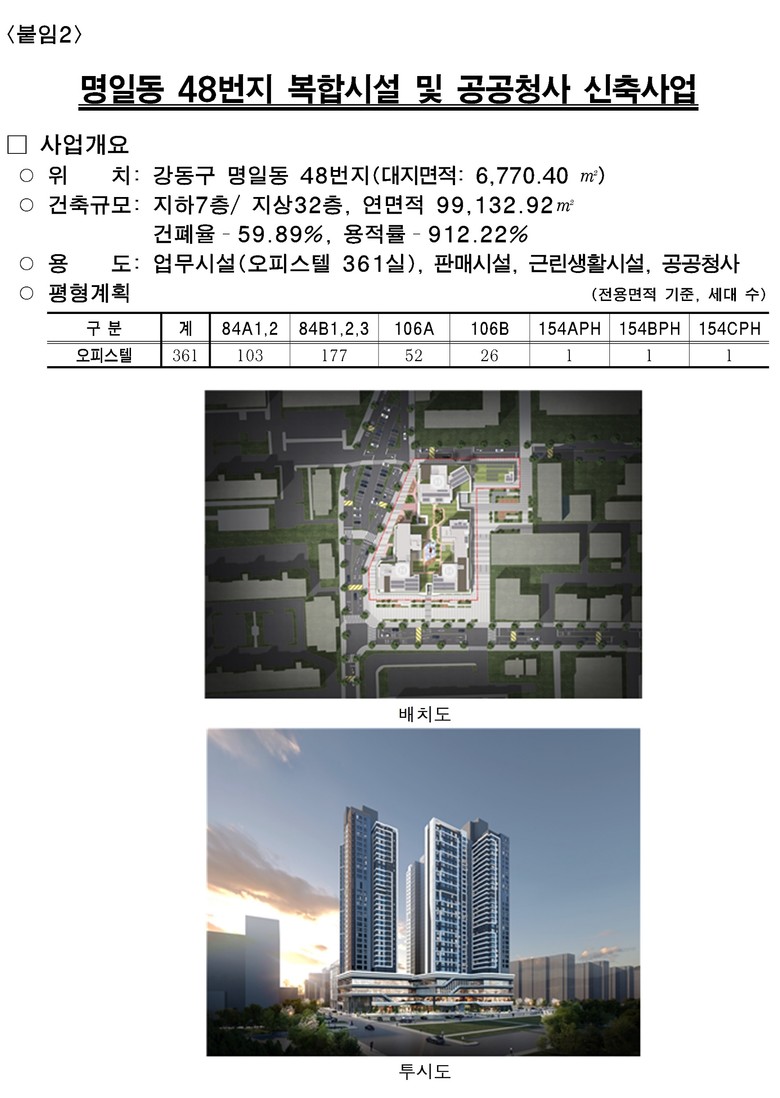 명일동 복합시설은 고덕역(5호선)과 9호선 연장 예정지 인근 교통요충지에 지하 7층·지상 32층 규모 복합시설이 들어선다. 오피스텔 361실과 함께 판매시설, 근린생활시설, 공공청사가 결합된 복합타워로 조성된다.