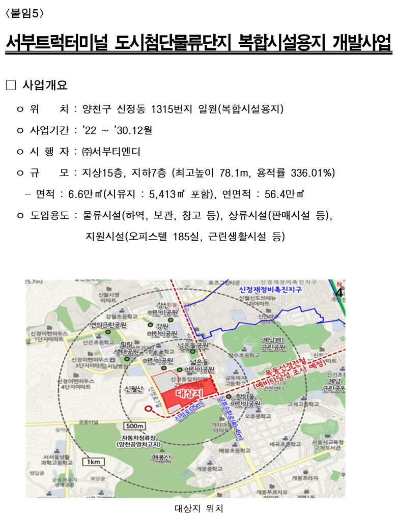 양천구 신정동 서부트럭터미널은 약 56만㎡ 규모의 도시첨단물류단지로 재탄생한다. 지하 7층·지상 15층 규모로 물류시설 약 28만㎡, 판매시설 약 19만㎡, 오피스텔 180여실과 체육·문화시설이 함께 들어선다.