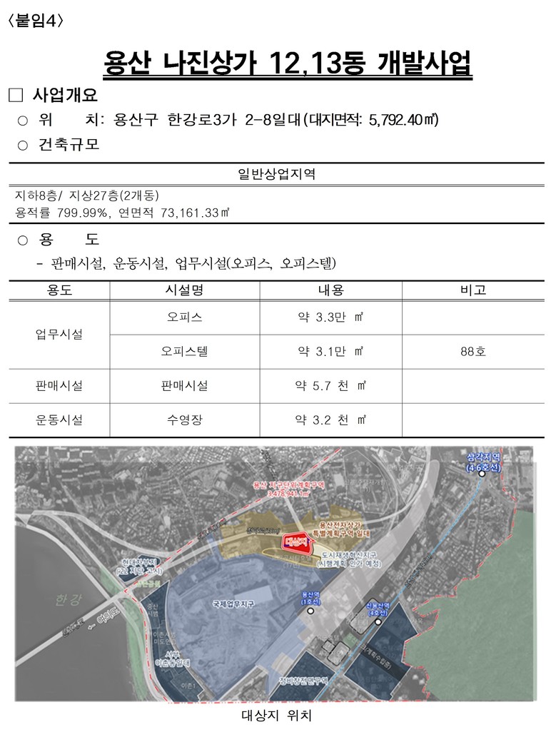 용산 나진상가 12·13동 일대는 ICT·AI 등 신산업 중심 업무시설과 주거·판매 시설이 결합된 전자상가 혁신거점으로 조성된다. 지하 8층~지상 27층 규모로 업무시설 약 3만3천㎡, 오피스텔 88실, 판매시설과 운동시설이 복합배치된다.