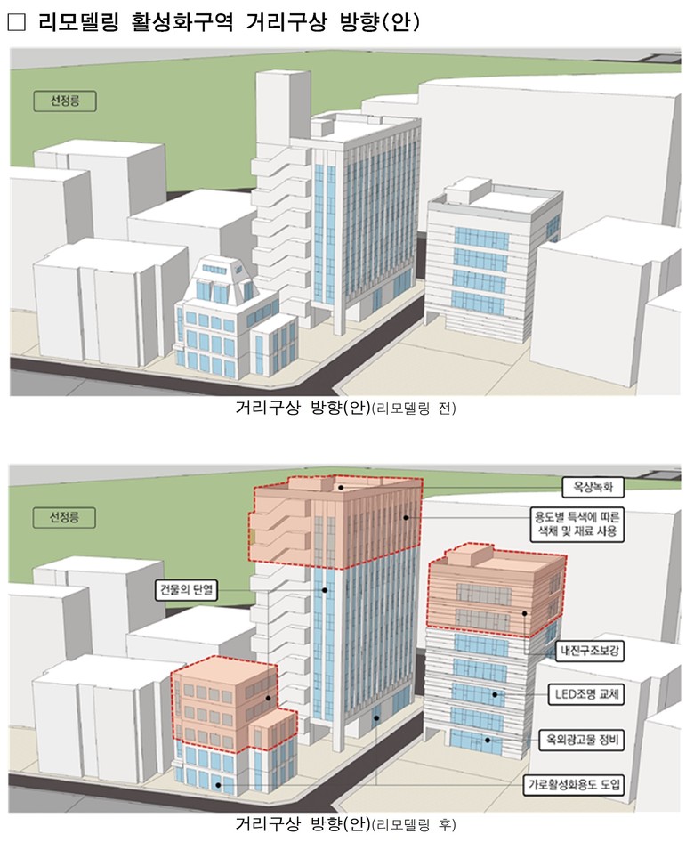 리모델링활성화구역은 구조 안전성 확보를 전제로 기존 연면적의 최대 30%까지 증축이 가능하며, 수직증축과 층수·높이 완화를 통해 부족한 업무공간을 확충하고 최신 오피스 수요에 대응할 계획이다.