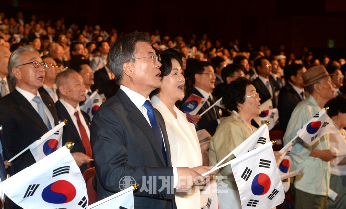 문재인 대통령이 부인 김정숙 여사, 참석자들과 15일 오전 제72주년 광복절 경축식이 열린 서울 종로구 세종문화회관에서 광복절 노래를 제창하고 있다. 2017.08.15.