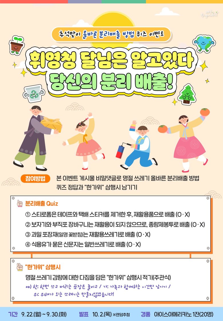 ▸ ‘추석맞이 올바른 분리배출 OX 퀴즈 이벤트’ 실시 [세계타임즈=대구 한윤석 기자] “추석 연휴, 쓰레기 배출일 꼭 확인하세요”
