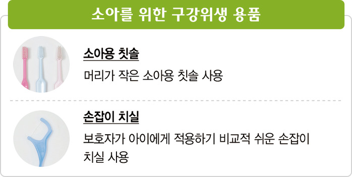 치아가 자라는 시기인 아이에게는 머리가 작은 소아용 칫솔을 사용하고, 물을 스스로 뱉을 수 있게 되면 불소가 함유된 치약을 사용한다. 어릴 때는 치실 사용이 어려우므로, 보호자가 손잡이가 있는 치실로 치아 사이를 관리해주면 좋다. 강동경희대병원 소아치과 김미선 교수는 “3개월 정기검진 및 치과에서 시행하는 전문가 불소도포와 더불어 저농도의 불소 가글용액을 가정에서 매일 사용하고 우유 성분으로 만들어진 치아 영양 크림을 양치질 후 치아에 발라주면 충치 예방효과를 증대할 수 있다”라고 말했다.