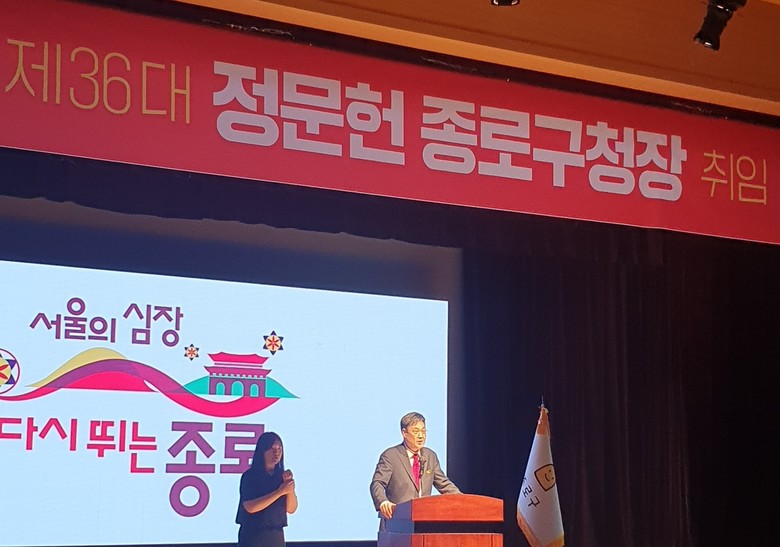 정 구청장은 지지와 성원해주신 모든 구민들께 감사의 인사를 전하며 “ 종로 구민을 섬기는 구정을 펼치겠다” 며 ‘미래문화의 산실이자 세계의 본이 되는 종로’를 제시하겠다고 취임사를 밝혔다.