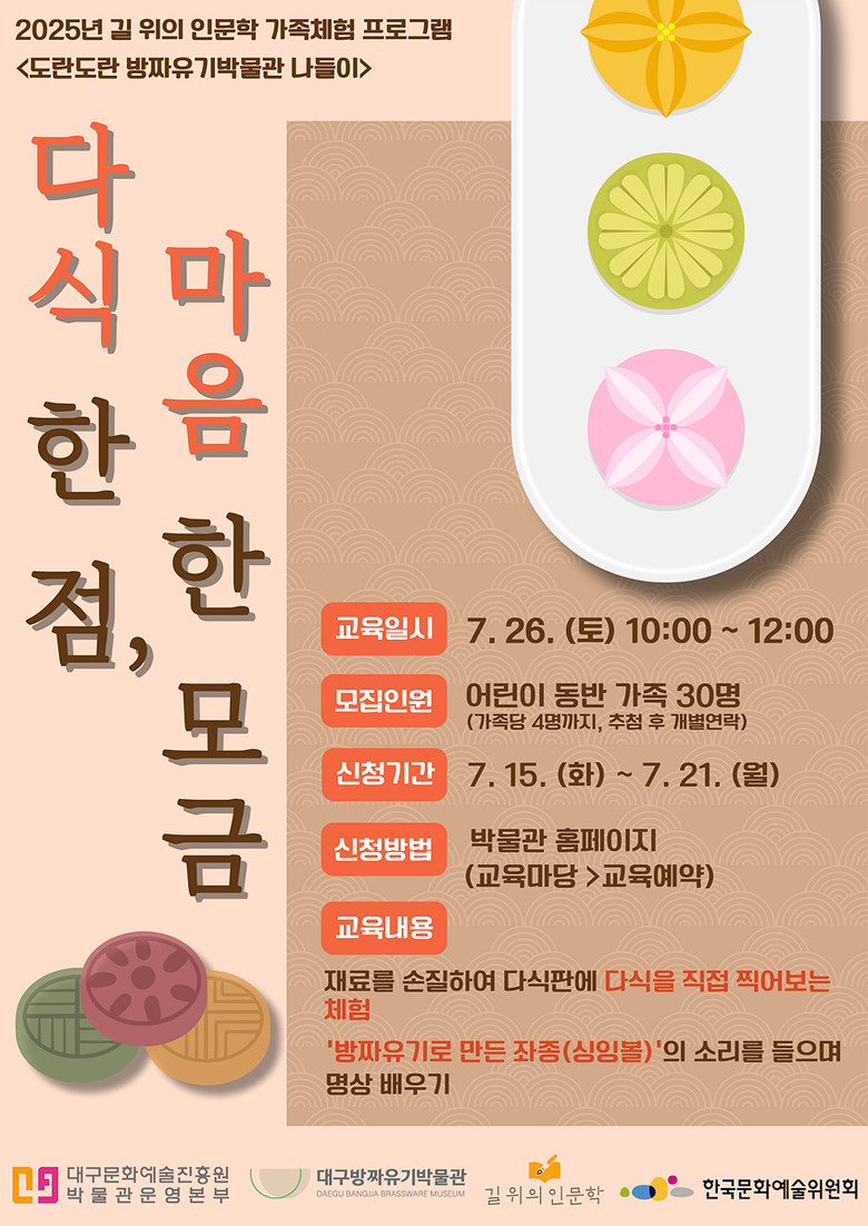 참가 신청은 7월 15일부터 21일까지 방짜유기박물관 누리집에서 예약약할 수 있다. 추첨을 통해 어린이와 동반 가족 30명(가족당 4명까지)을 선정할 예정이다.
