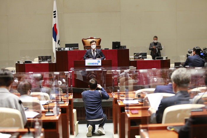 [세계타임즈 이진화 기자]4일 오후 서울 영등포구 여의도 국회 본청  국회 예결위 전체회의장에서 열린 더불어민주당 정책의원총회가 윤호중 원내대표가 참석한 가운데 열리고 있다.
