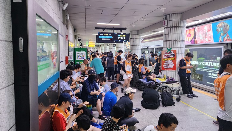 | ▲ 강경 대응 덕분인지 폭력행위는 줄어든 전장연 시위의 모습. 하지만 명분만 바꿔 불법점거는 그대로라는 점이 비판의 이유다. |