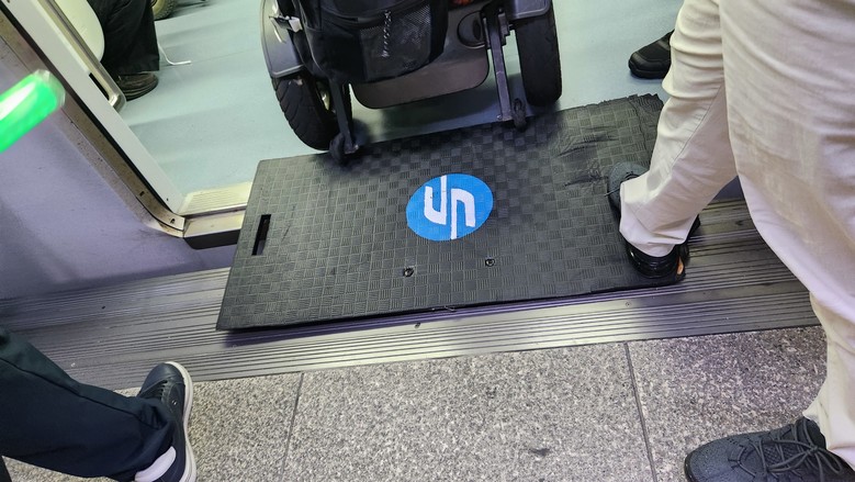 | ▲ 서울교통공사가 직접 만든 방패가 휠체어 탑승자를 위한 안전 발판으로 사용되고 있는 모습 |