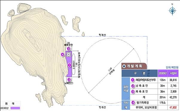 전액 국비 사업으로 주요 시설은 다목적부두(135m), 북측호안(36m), 남측호안(30m), 헬기 착륙장(1식) 등이다.