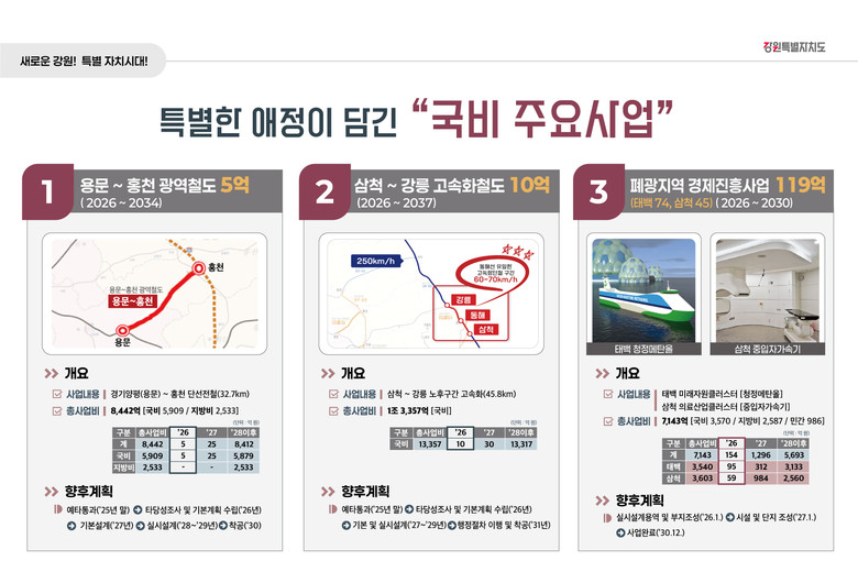 - 해당 사업들은 지난 8월 김진태 지사가 기획재정부 장관에게 직접 건의한 3대 핵심사업들로 모두 반영되었다.