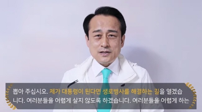 만물의 영장으로 살고 있지 않다면 저를 대통령으로 뽑아 주십시오. 제가 대통령이 된다면 생로병사를 해결하는 길을 열겠습니다.