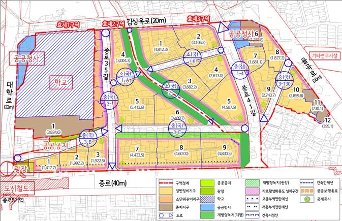 효제동 일대 정비계획의 주요 내용은 3개 정비구역에 정비유형별 총 30개소의 지구를 계획하여 유형별 건폐율, 용적률, 높이 등 건축물 밀도를 계획하였으며 특히, 중규모 이상의 복합용도 개발을 통해 도심 경쟁력을 강화하고자 부지면적 3천제곱미터 이상으로 2개 이상의 용도를 계획하는 경우에는 기준높이 70m에서 20m를 추가 완화할 수 있도록 하였다.