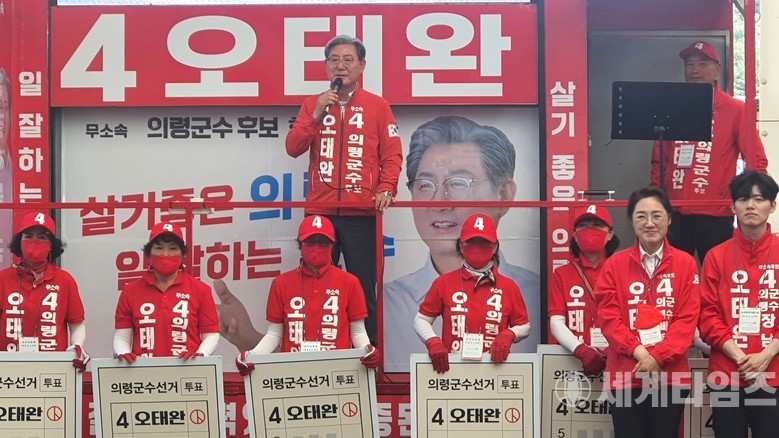 [세계타임즈 = 이진화 기자] 6.1지방선거 마지막날인 31일 오후 부림면 신반시장에서 재선에 도전하는 무소속 오태완 경남 의령군수 후보가 지지를 호소하는 유세를 하고 있다.