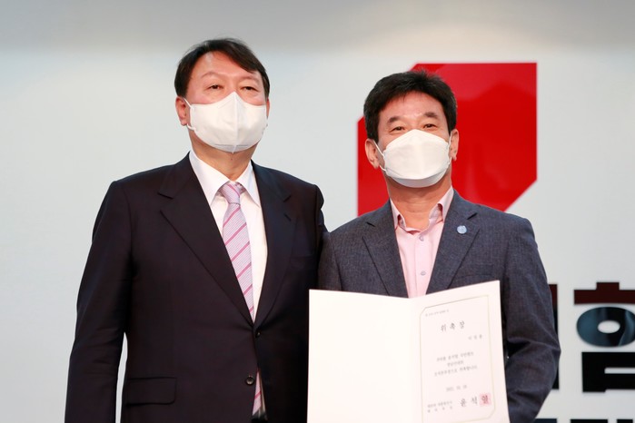 [세계타임즈 이진화 기자]국민의힘 대선 예비후보인 윤석열 전 검찰총장이 19일 오전 경남 창원시 의창구 경남도당에서 열린 '윤석열 국민캠프 경남선대위 임명장 수여식'에서 이성용 경남선대위 조직본부장과 함께 기념촬영을 하고 있다.