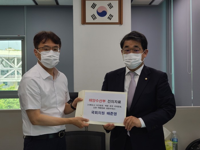 또 전재우 해운물류국장에게는 ▲서북도서 야간운항 제한 개선 및 항로 직선화 ▲인천~백령항로 대형여객선 도입을 위한 국비 지원 ▲’백령~중국 국제항로 개설‘이 제27차 한·중 해운 회담 의제로 채택될 수 있도록 건의해줄 것을 요청했다.