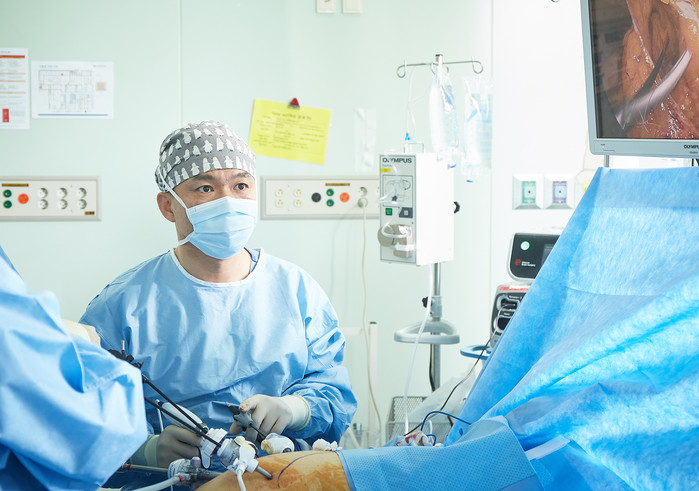 | ▲최성일 교수가 복강경으로 루와이우회술을 진행하고 있다. |