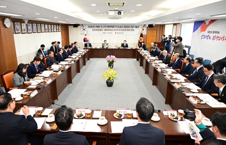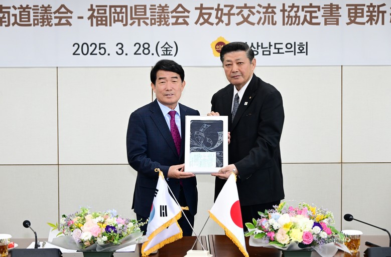 [경남 세계타임즈=최성룡 기자] 경상남도의회(의장 최학범)는 3월 28일 일본 후쿠오카현의회 고하라 가츠지 의장을 비롯한 대표단 22명이 경상남도의회를 방문하여, 우호교류 협정서 갱신 및 원 헬스(one Health) 분야 협력 강화를 위한 양해각서를 체결했다고 밝혔다.