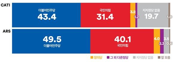 ARS, 더불어민주당 하락분이 국민의힘 상승으로 이어져. 격차 한자릿 수로 크게 좁혀(9.4%p)