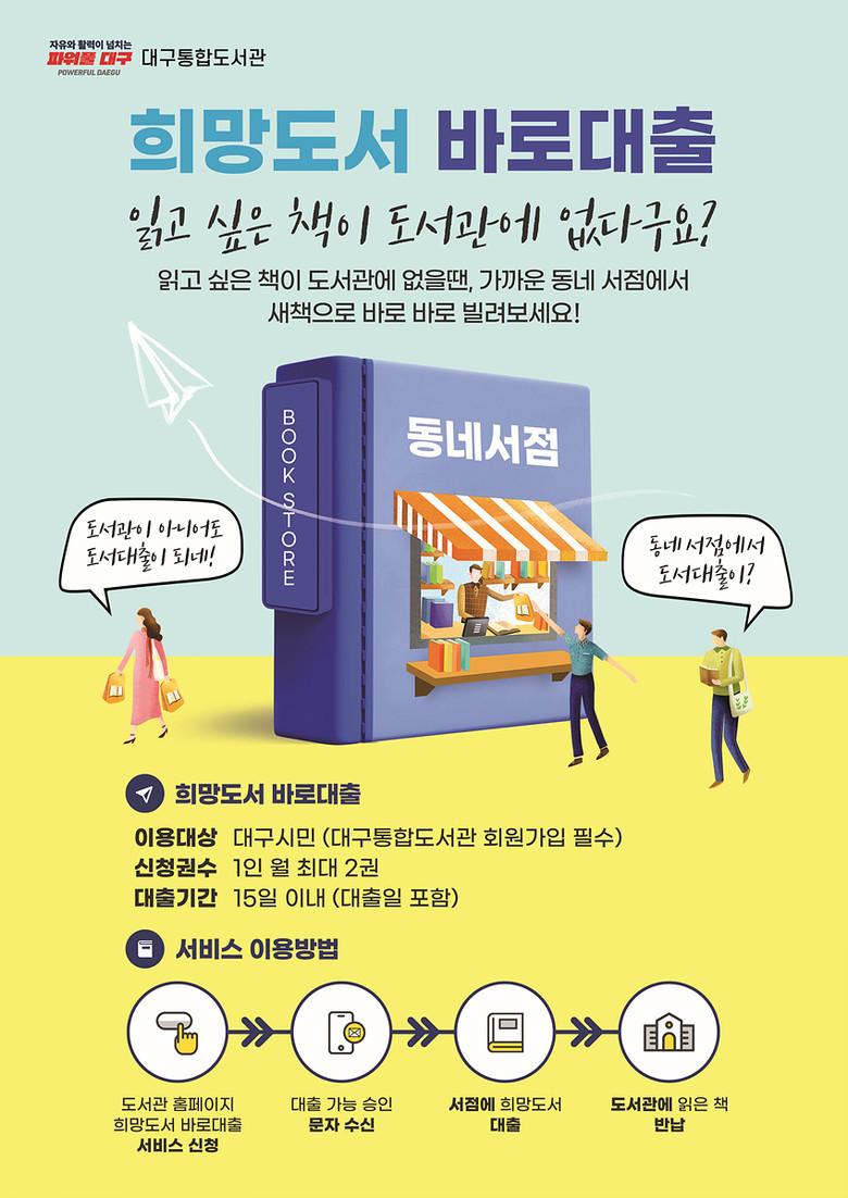 희망도서 바로대출 서비스는 공공도서관의 희망도서 처리기한 단축, 도서관에 방문하지 않고 집에서 가까운 서점에서 희망도서 대출이 가능해 이용자 편의성을 획기적으로 개선한 도서관 특화 서비스로, 도서관이 지역서점의 도서를 구입함으로써 지역경제 활성화에도 도움이 되고 있다.