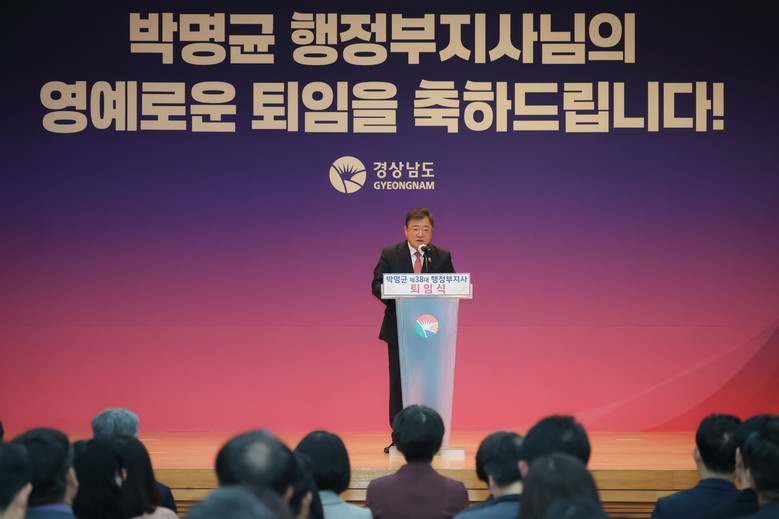- 탁월한 행정력과 헌신으로 경남 도정 역사에 뚜렷한 공적 남겨 [세계타임즈=경남 최성룡 기자] 박명균 경상남도 행정부지사는 11일 오전 도청 본관 4층 대회의실에서 직원들과 함께 퇴임식을 갖고 30년간의 공직생활을 마무리했다.