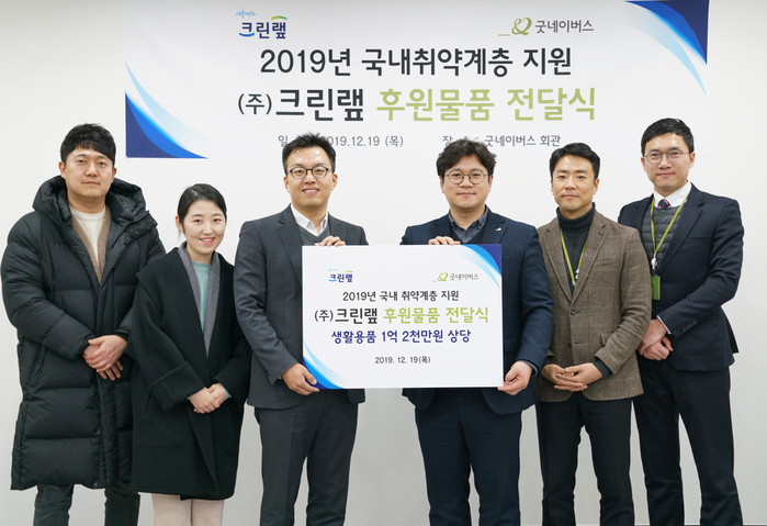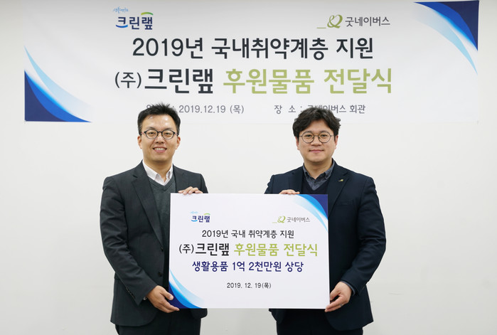 식품포장 분야 국내 1위 크린랲(대표 승문수)이 미혼모 가정 후원에 이어 국제구호개발 NGO 단체인 굿네이버스에 1억2000만원 상당의 생활용품을 기부했다고 밝혔다.