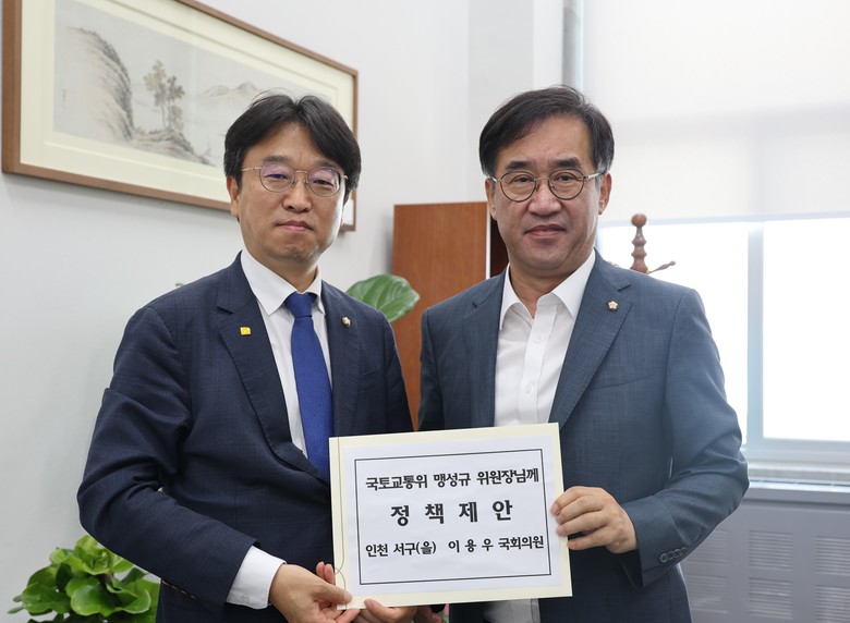 [세계타임즈 = 심귀영 기자] 더불어민주당 인천 서구(을) 이용우 국회의원은 국회 국토교통위원회 맹성규 위원장에게 지역 현안 해결을 담은 정책제안서를 전달하고 국토교통위원회의 적극적인 지원과 협조를 요청했다고 밝혔다.