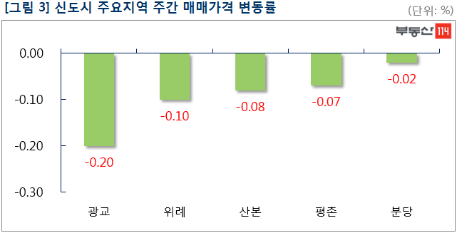 신도시는 ▼광교(-0.20%) ▼위례(-0.10%) ▼산본(-0.08%) ▼평촌(-0.07%) 등이 내림세를 나타냈다. 광교는 급매물이 늘면서 이의동 광교자연앤힐스테이트가 1,000만원 하락했다. 위례는 학암동 위례롯데캐슬이 250만원-2,500만원 떨어졌다.