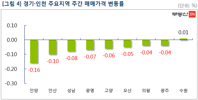 부동산114(www.r114.com)에 따르면 금주 서울 아파트 매매가격 변동률은 -0.06%로 집계됐다. 재건축 아파트는 -0.14%로 한 주전(-0.09%)에 비해 낙폭을 다시 키웠다. 이밖에 신도시는 -0.03% 경기·인천은 -0.02%의 하락률을 기록했다. 전세가격은 서울이 0.07% 떨어졌고 신도시와 경기·인천은 각각 -0.12%, -0.09%로 약세 행진을 계속했다.