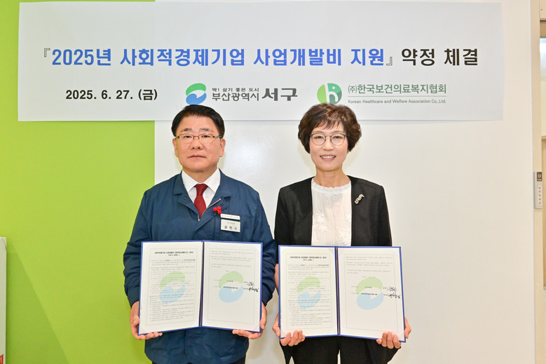 [서구 세계타임즈=이용우 기자] 부산 서구(구청장 공한수)는 ‘2025년 사회적경제기업 사업개발비 지원 사업’ 공모에 선정된 관내 예비사회적기업 ㈜한국보건의료복지협회(대표 박영임)와 사업개발비 지원 약정을 체결했다.
