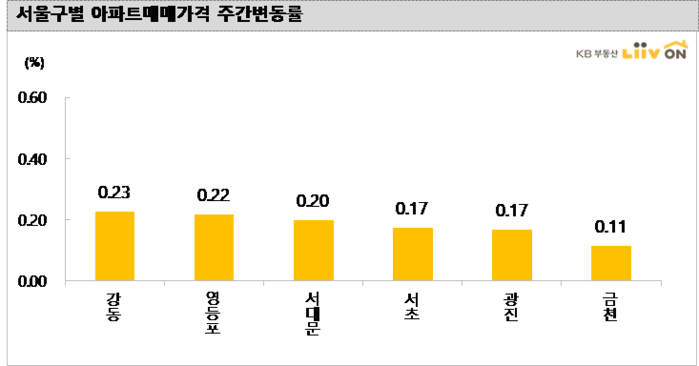 서울 아파트 매매가격은 전주대비 0.09%의 변동률을 기록하며 9주 연속 상승세를 이어가고 있으나 상승폭이 줄어들고 있다. 강동구(0.23%), 영등포구(0.22%), 서대문구(0.20%), 서초구(0.17%), 광진구(0.17%) 순으로 다른 구에 비해 상승폭이 상대적으로 높았다.