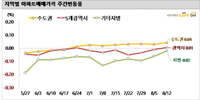 8월 12일 기준 전국 아파트 매매가격 변동률은 0.02%로 상승을 기록했다. 인천을 제외한 5개 광역시(0.01%)는 대전(0.11%), 대구(0.01%)가 상승한 반면, 울산(-0.03%)과 부산(-0.03%), 광주(-0.02%)는 하락을 보였다. 기타 지방(-0.02%)은 전주대비 하락을 기록했다.