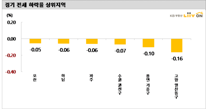 광명(0.26%), 성남 분당구(0.20%), 부천(0.12%), 성남 수정구(0.09%) 등은 상승하였고, 안산단원구(-0.16%), 군포(-0.03%), 오산(-0.03%) 등은 하락했다.