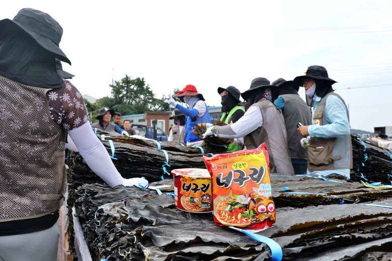 농심과 완도의 인연은 1982년 너구리를 출시하며 시작됐다. 당시 농심은 차별화된 해물우동의 맛을 구현하기 위해 완도 다시마를 원물 그대로 큼지막하게 넣기로 결정했다. 이후 농심은 매년 400톤 안팎의 다시마를 구매하고 있다. 이는 국내 식품업계 최고 수준이며 올해까지 누적 구매량은 약 1만 8천 톤에 달한다.