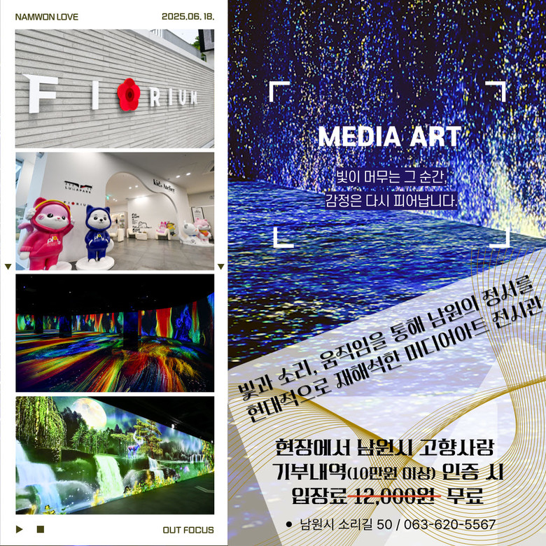 「피오리움」은 남원시에서 운영하는 문화체육관광부 공모사업으로 조성된 실감몰입형 미디어아트 복합문화공간으로, 함파우 아트밸리·광한루원 등과 함께 연계하여 남원시 대표 가족 체류형 관광지로 손꼽히고 있으며 입장료는 1만 2천원이다. 전시관을 찾은 관람객은 현장에서 2025년에 남원시에 10만원 이상 고향사랑기부한 내역(고향사랑e음 마이페이지, 기부금 영수증등)을 제시하고 「피오리움」 무료입장 혜택을 누릴 수 있다. 무료입장 혜택은 기부금액 10만원 당 1명씩 적용되며, 예컨대 2025년에 남원에 20만원을 기부한 경우 동반 1명까지 무료입장이 가능하다. 이벤트는 2025년 12월 31일까지 계속될 예정이다.