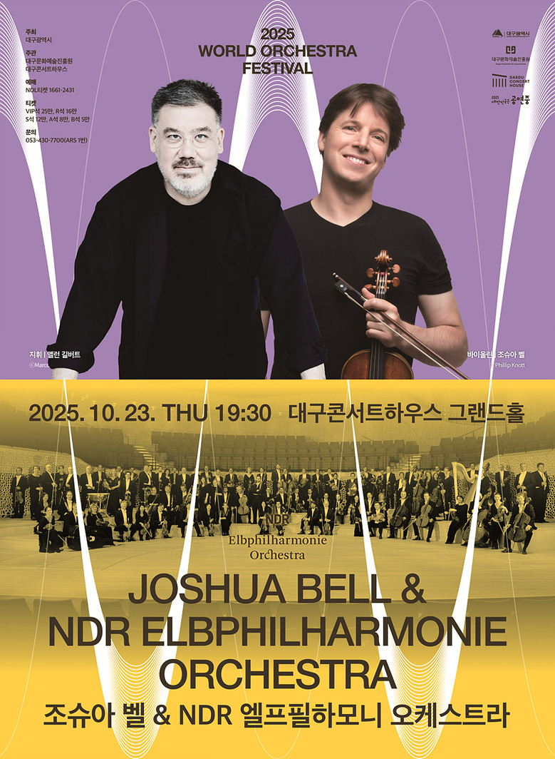 ▸ 현대 영국 작곡가 안나 클라인의 현대작품 <요동치는 바다> 한국 초연 [세계타임즈=대구 한윤석 기자] 독일 함부르크의 명문 악단 NDR 엘프필하모니 오케스트라(이하 NDR 엘프필)가 오는 10월 23일(목) 오후 7시 30분, 대구콘서트하우스 그랜드홀에서 10년 만의 내한 공연을 선보인다. 세계적인 바이올리니스트 조슈아 벨과 함께 꾸미는 이번 무대는 클래식 애호가들의 큰 기대를 모으고 있다.