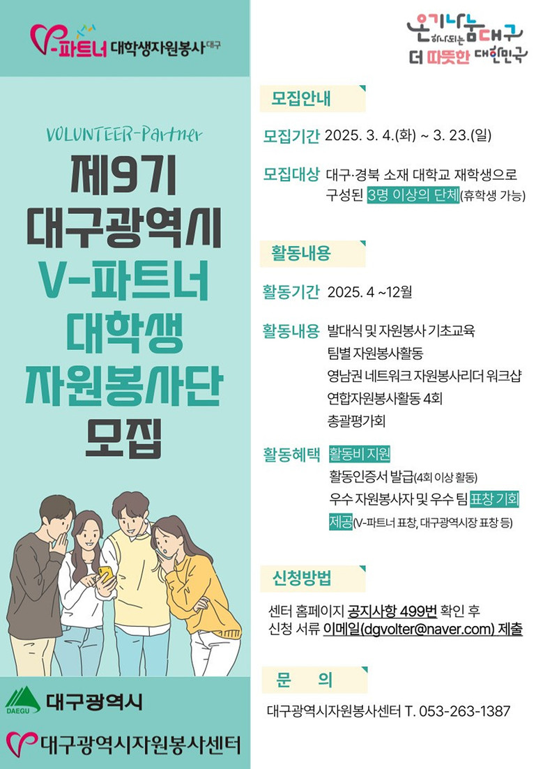 제9기 V-파트너 대학생 자원봉사단 모집 기간은 3월 23일(일)까지이며, 신청은 대구광역시자원봉사센터 홈페이지 공지사항(게시글 번호 499번)을 참고하여 신청서 작성 후 이메일로 제출하면 된다.