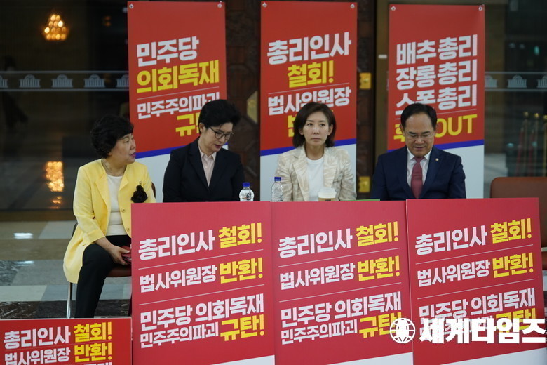 '나경원' 국민의힘 의원이 30일 국회 로텐더홀 앞에서 김민석 국무총리 지명 철회·법사위원장 반환 촉구 농성 4일째 이어가고있다.