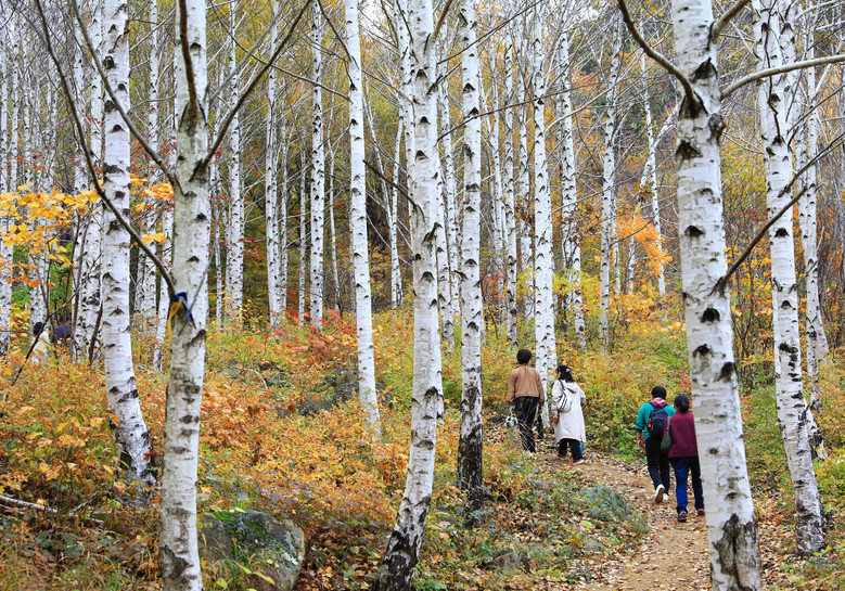 등산로를 따라 전망대로 올라가면 고도 800m를 훌쩍 넘기는 높이에서 자작나무숲 일대를 조감할 수 있다. 빼곡하게 수놓인 나무의 하얀 수피들 사이로 알록달록 피어오른 단풍은 늘상 봐오던 단풍나무들과는 색다른 감동을 선사한다.
