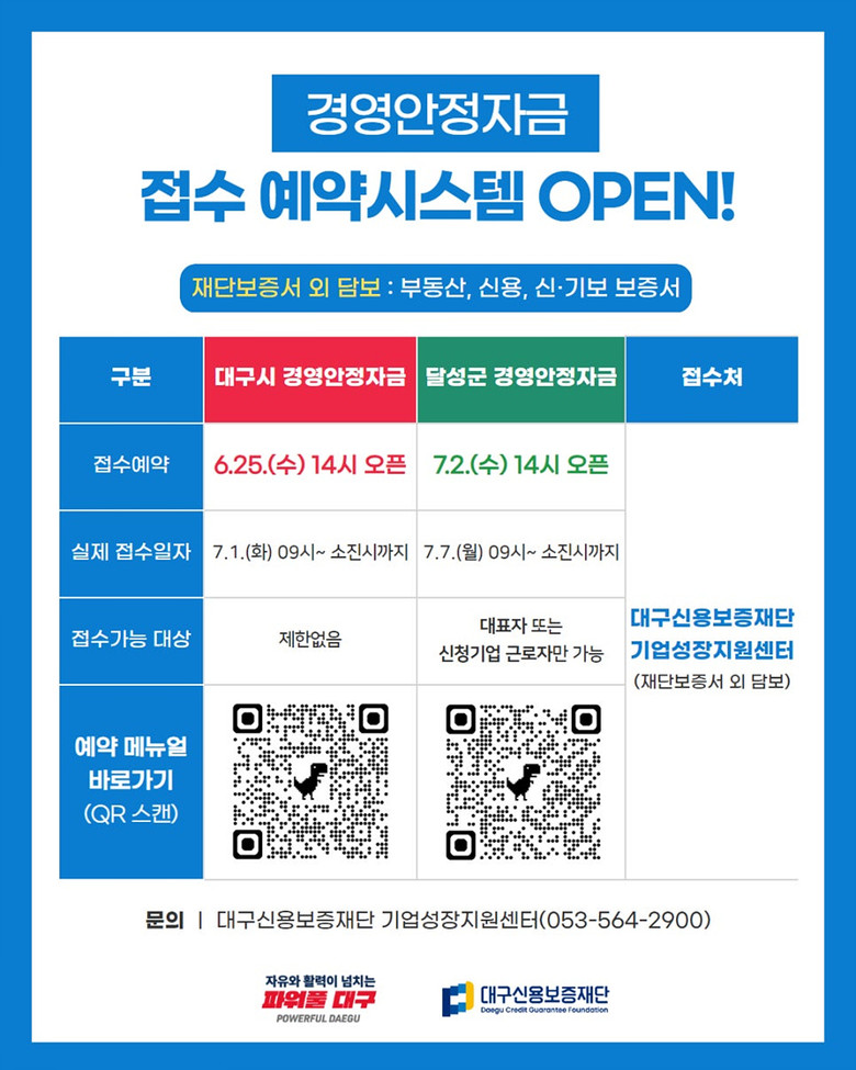 한편, 하반기 대구시 경영안정자금의 사전 예약은 6월 25일(수) 오후 2시 오픈(실제 서류접수는 7월 1일(화)부터 시작), 달성군 경영안정자금의 사전 예약은 7월 2.일(수) 오후 2시(실제 서류접수는 7월 7일(월)부터 시작)에 오픈할 예정이다.