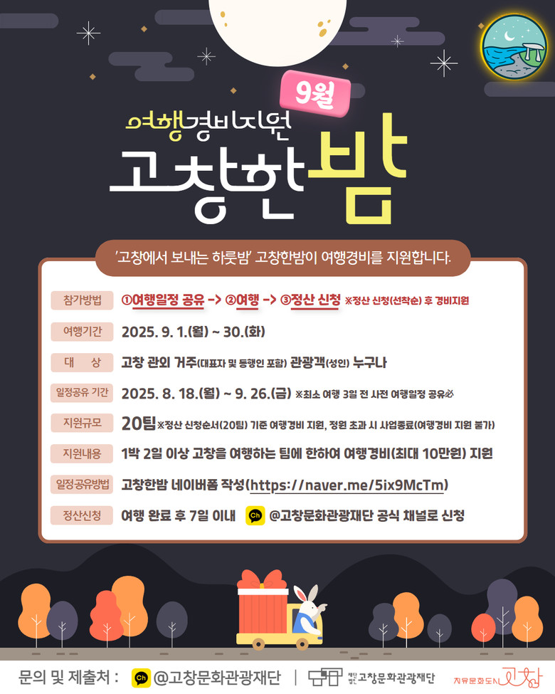 조창환 고창문화관광재단 상임이사는 “고창한밤은 여행객에게는 실질적인 혜택을, 지역에는 활력을 주는 상생형 모델”이라며 “이번 9월에도 많은 분들이 고창의 자연과 문화, 사람들을 만나 특별한 시간을 보내길 바란다”고 전했다.