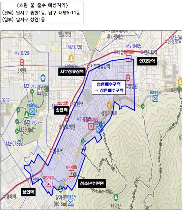 이번 배수구역 조정으로 5월 22일(목) 22시부터 다음날 06시까지 달서구 송현1동, 남구 대명6·11동 전역 및 달서구 상인1동 일부 2만 4천 세대에서 흐린 물이 나올 수 있다.
