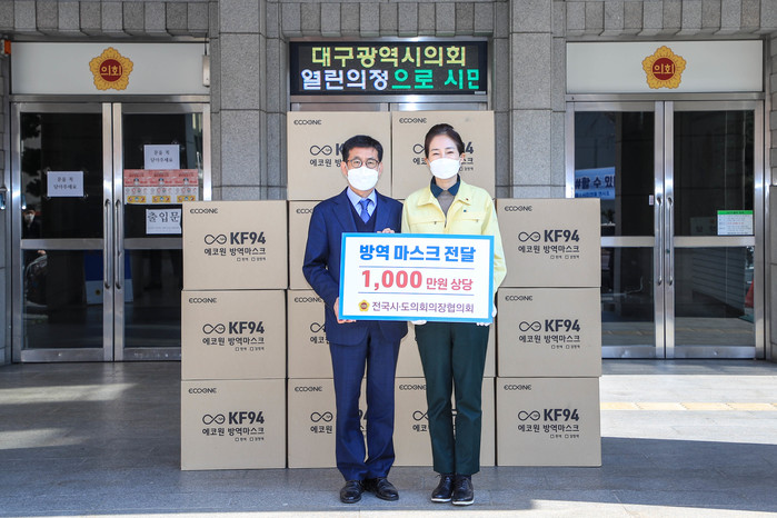 [대구=세계타임즈 한성국 기자] 대구광역시의회 배지숙 의장은 3월 2일(월) 오후 2시 시의회 1층에서 전국시·도의회의장협의회가 기부한 마스크 7천장을 인수해서 대구광역시로 전달했다.